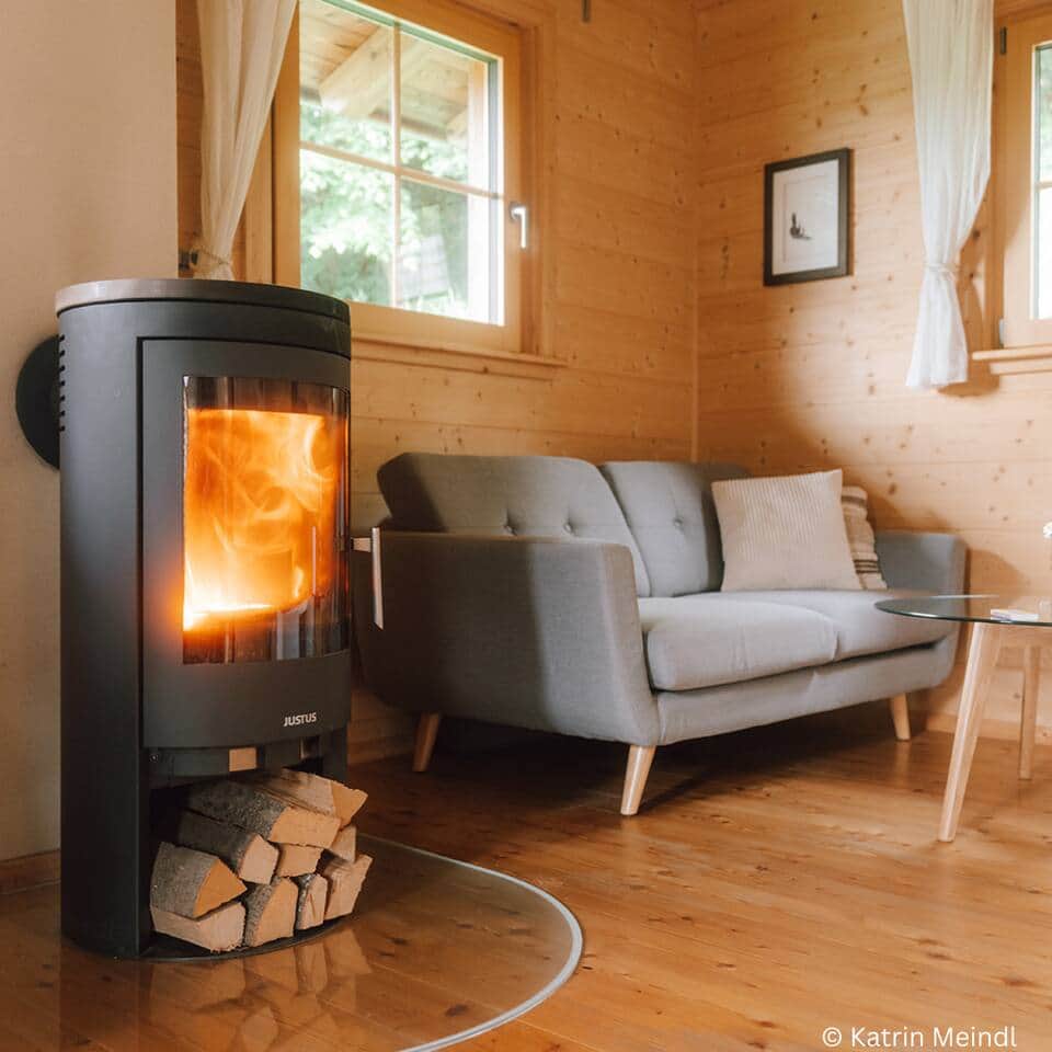 Im Holzblock-Chalet brennt der Kamin und schafft eine warme, ruhige Atmosphäre. Auf der überdachten Terrasse blickst du ins Tal und genießt die Stille der Umgebung.
